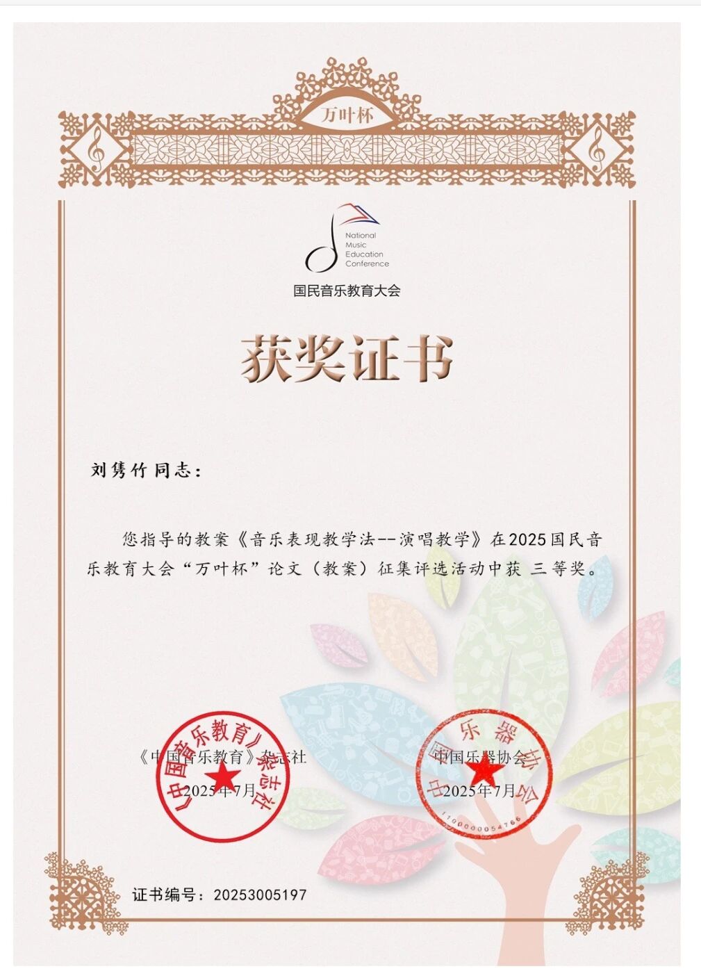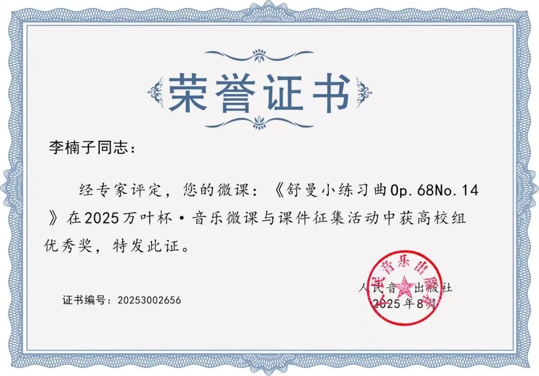 在2025“万叶杯”论文(教案)征集评选活动中,刘隽竹老师的教案《音乐表现教学法--演唱教学》荣获三等奖。