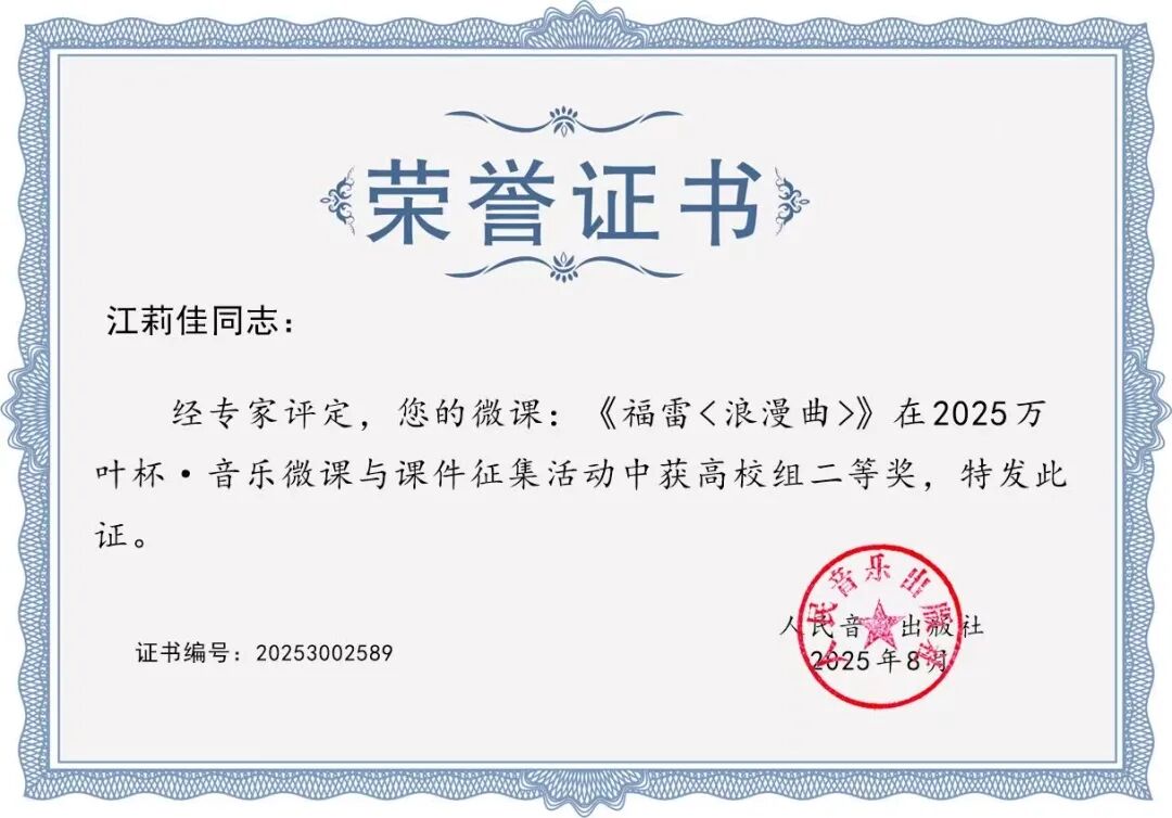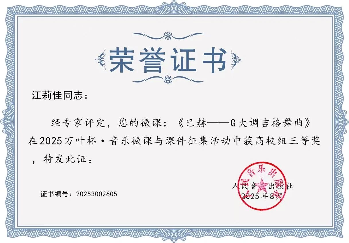 江莉佳老师凭借微课《福雷〈浪漫曲〉》斩获二等奖,其作品以细腻的音乐分析与生动的教学呈现,带领学习者深度感知浪漫主义音乐的魅力;同时,她的另一微课《巴赫——G大调吉格舞曲》也荣获三等奖,在巴洛克音乐的教学中展现了扎实的学术功底。