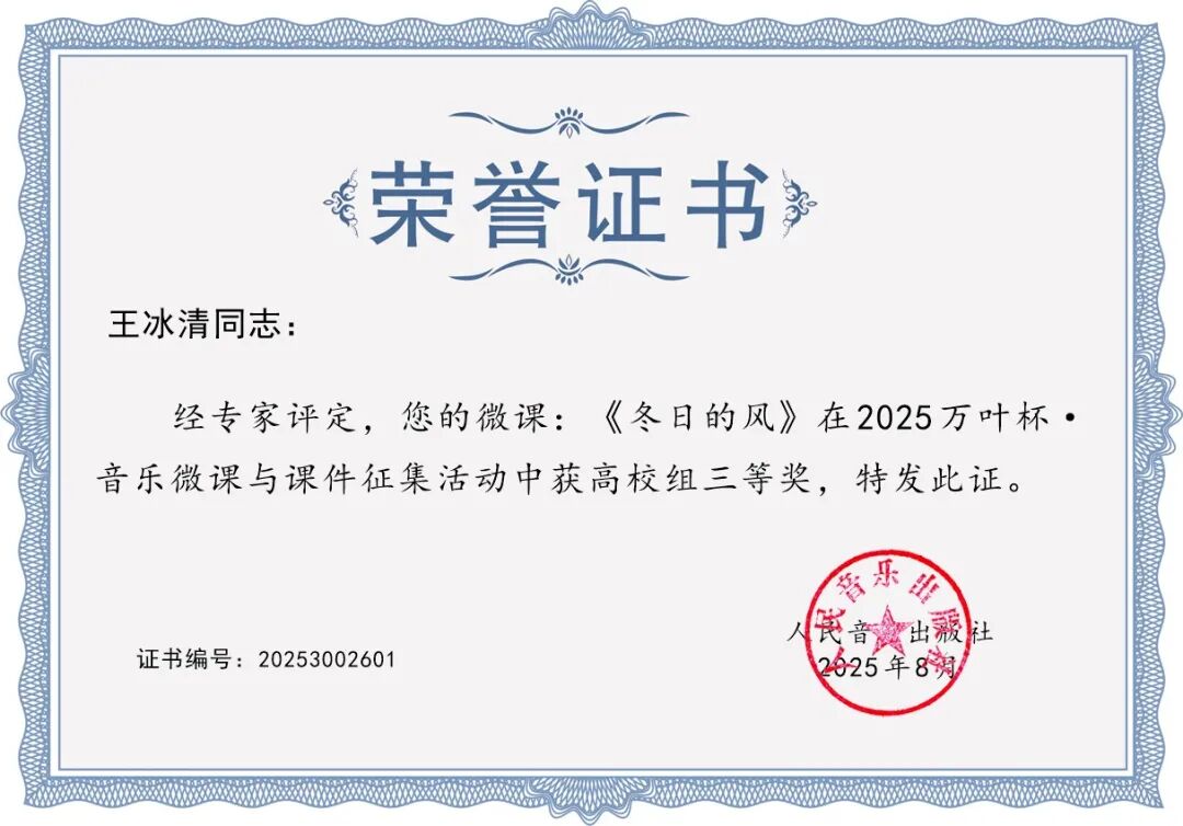 王冰清老师的微课《冬日的风》荣获三等奖,以富有画面感的音乐表达,让听众在旋律中感受季节与情绪的交融。