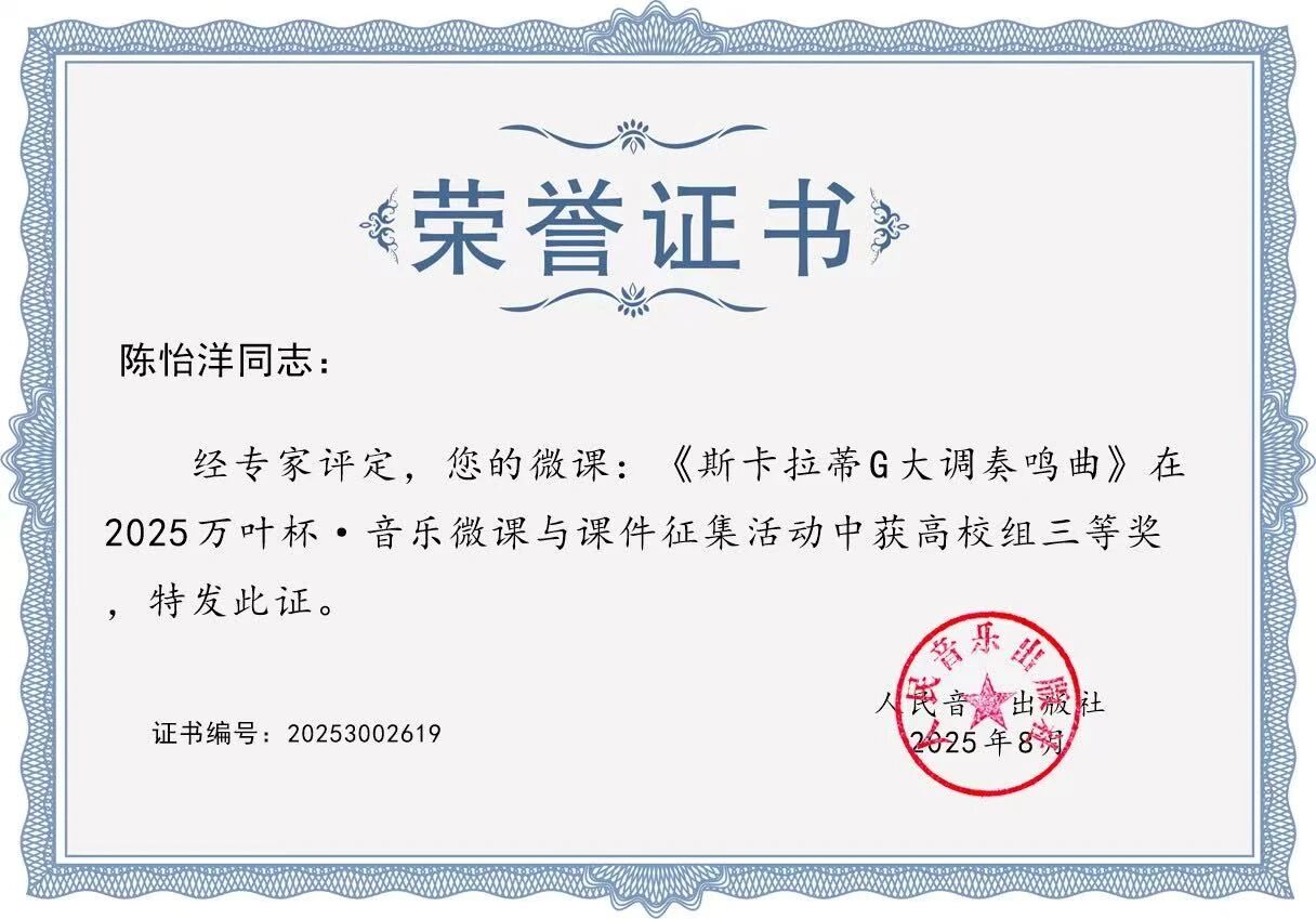 陈怡洋老师的微课《斯卡拉蒂G大调奏鸣曲》荣获三等奖,通过对古典主义奏鸣曲的解析,为学习者搭建了理解早期奏鸣曲式的清晰路径。