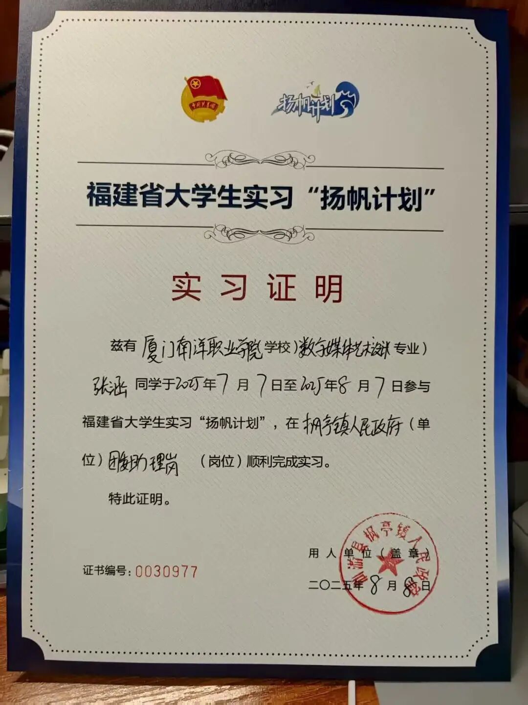 少年逐光,青春飞扬。今天要和大家分享张涵同学的“扬帆计划”实习故事。作为厦门南洋职业学院数字媒体艺术设计专业的学生,2025年7月7日至8月7日,他通过福建省大学生实习“扬帆计划”,走进枫亭镇人民政府政务处理岗,开启了为期一个月的基层实习之旅。这段时光里,他以热忱为墨,以行动为笔,在红色文化传承与非遗保护的实践中,书写了属于自己的青春成长篇章。