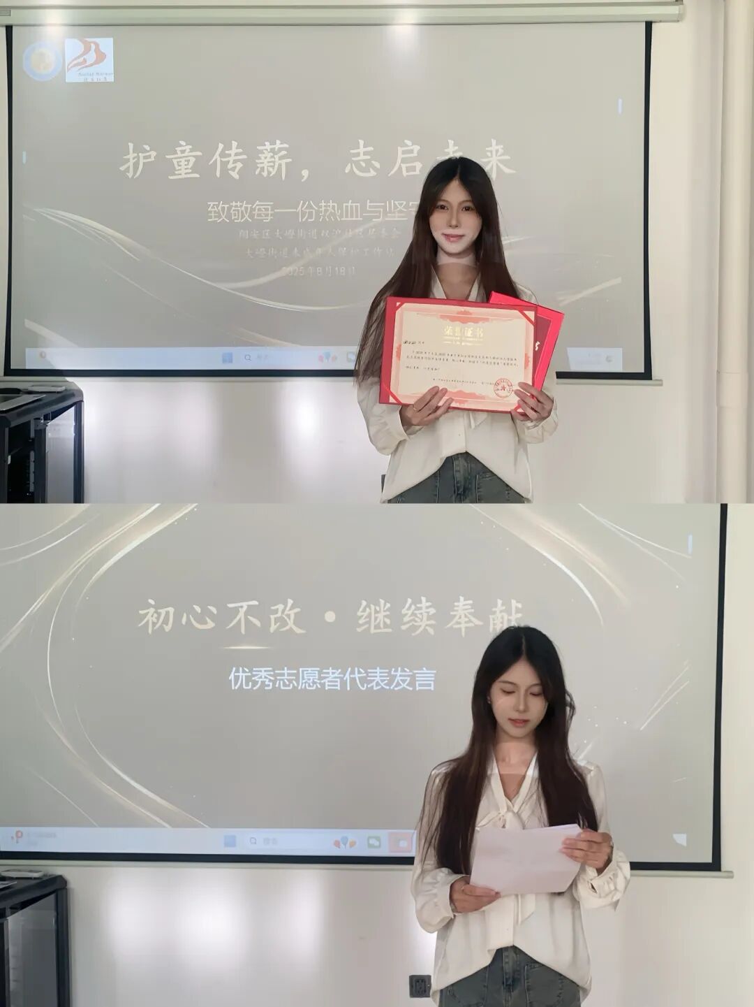 实习尾声,谢沚妍的出色表现得到了街道儿童督导主任、社区儿童主任和社区妇联主席的高度评价。在表彰大会上,他们作为代表对谢沚妍的工作给予了充分肯定。这份认可不仅见证了谢沚妍过往的努力与付出,更让她坚定了在基层服务、民生关怀领域“逐光前行”的决心。