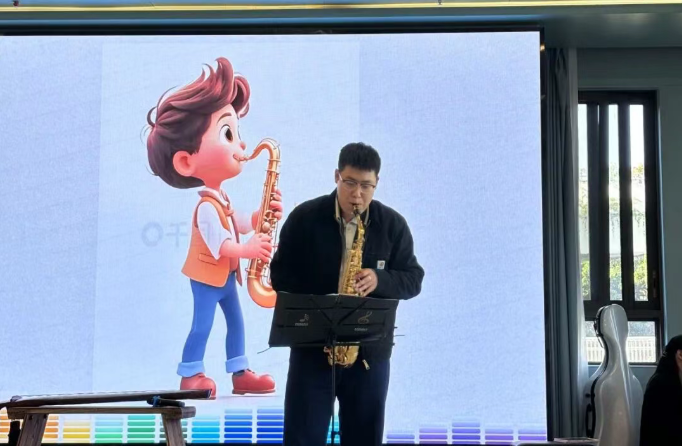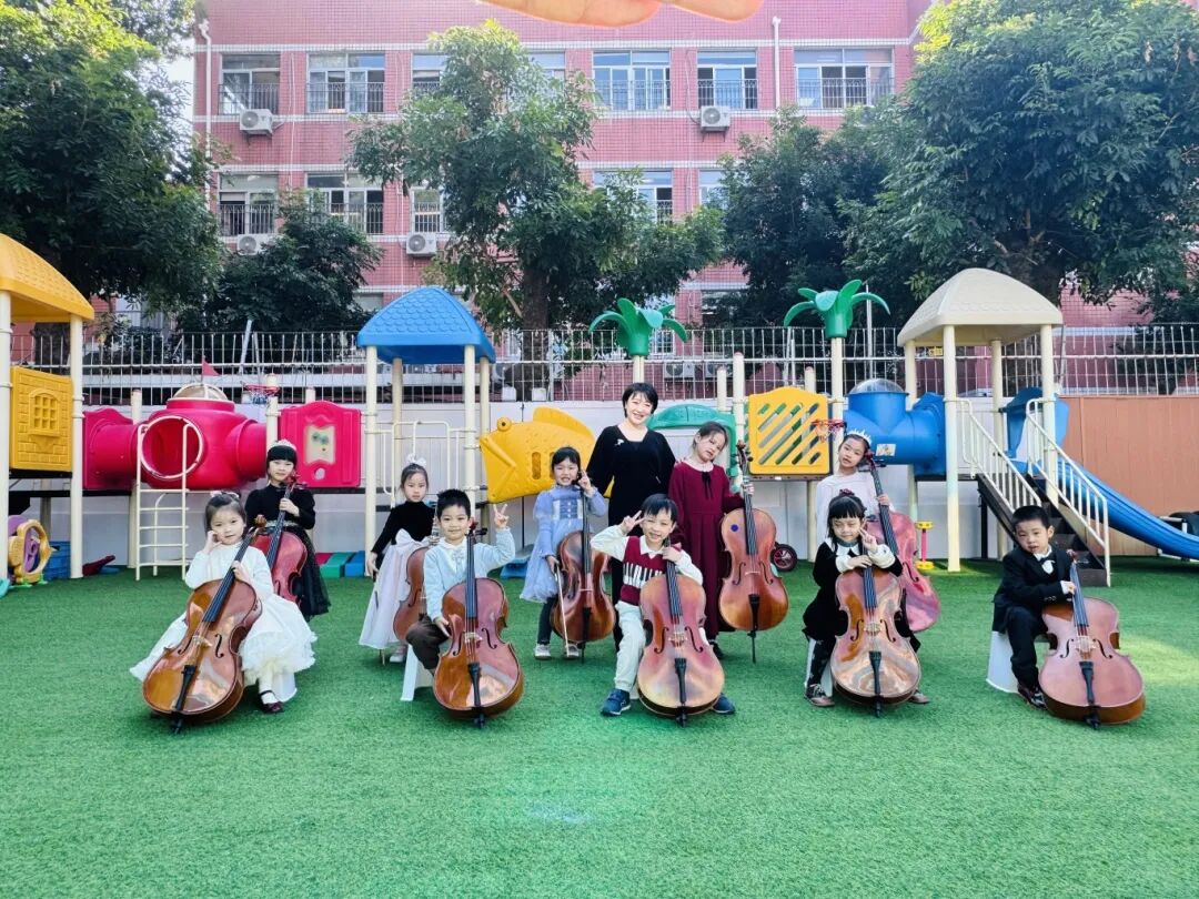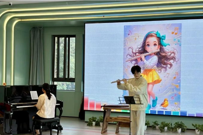 随后,师生团队来到厦门湖明幼儿园,继续推进艺术普及工作。活动现场,齐悦老师深情演绎经典大提琴曲目,旋律婉转悠扬,赢得小朋友们的阵阵掌声;音乐表演W21级阮黄旭同学则聚焦中国传统乐器,详细讲解竹笛的构造与演奏技巧,结合经典民乐片段展示,让孩子们深入感受传统乐器的独特韵味。师生们以专业且富有亲和力的表现,搭建起中西艺术交流的桥梁,让小朋友们全方位体验中西乐器的魅力,现场始终洋溢着温暖欢快的艺术氛围。