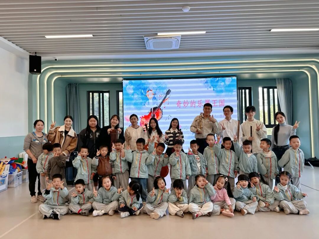 在厦门五缘实验幼儿园,活动由表演系王冰清主任带队,音乐表演(器乐)专业学生全程参与,以“奇妙的乐器王国”为主题打造了一堂沉浸式艺术公开课。课堂上,师生团队系统梳理乐器品类,生动介绍了小提琴、大提琴等西方管弦乐器,以及古琴、洞箫、竹笛等中国传统乐器的起源与特点。为让孩子们直观感受艺术魅力,师生们轮番进行现场演示,悠扬的小提琴声、醇厚的大提琴声、清亮的竹笛声交替响起,同时设置互动演奏环节,邀请小朋友近距离触摸乐器、感受节奏,在轻松愉悦的氛围中引导孩子们分辨不同乐器的音色特质,完成艺术启蒙的初体验。