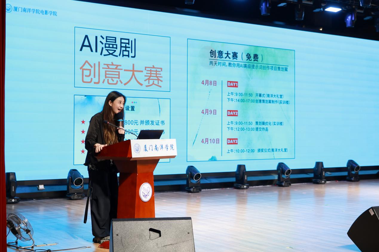 厦门壹玖零伍文化传媒有限公司负责人周生生女士上台,为分享了关于影视行业的新业态 ——AI 漫剧,并深度剖析了漫剧的制作流程:剧本孵化、制作、后期剪辑、上线发行四大环节,同时为大家详细说明漫剧行业的工作流,以及本次创意大赛的内容方向、创作要求与交付标准,为参赛选手厘清创作思路、明确参赛方向。
