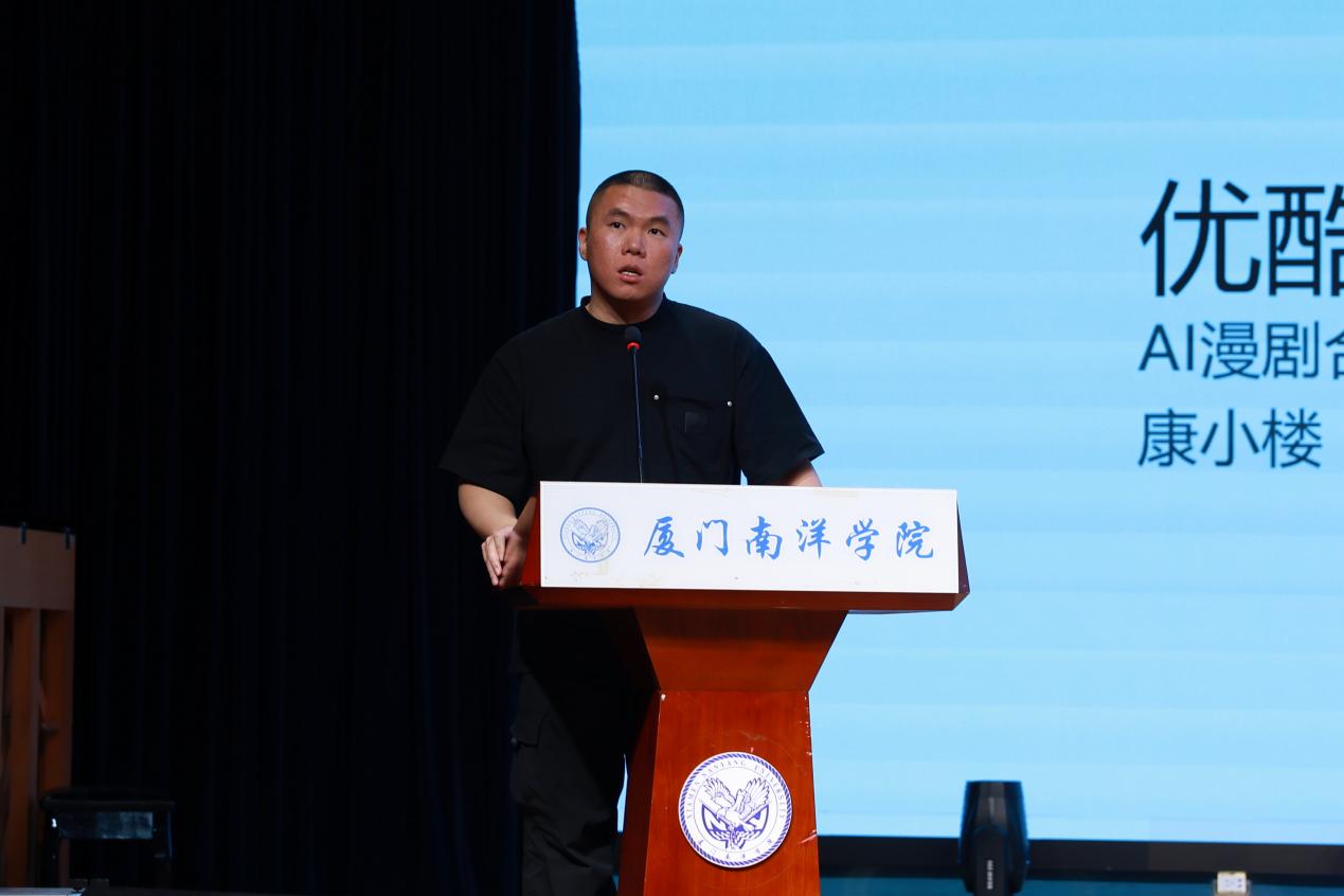 优酷 AI 漫剧合伙人计划项目负责人康小楼先生上台,围绕本次项目进行主题分享,为现场师生细致解读项目发起的初心、平台扶持政策及未来发展愿景,解读 AI 技术如何赋能漫剧创作、助力青年创作者实现从创意到作品的落地成长。